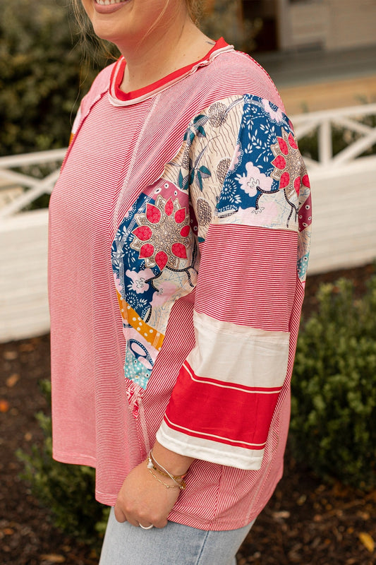 Plus Size Exposed Seam Printed Striped Round Neck Sweatshirt