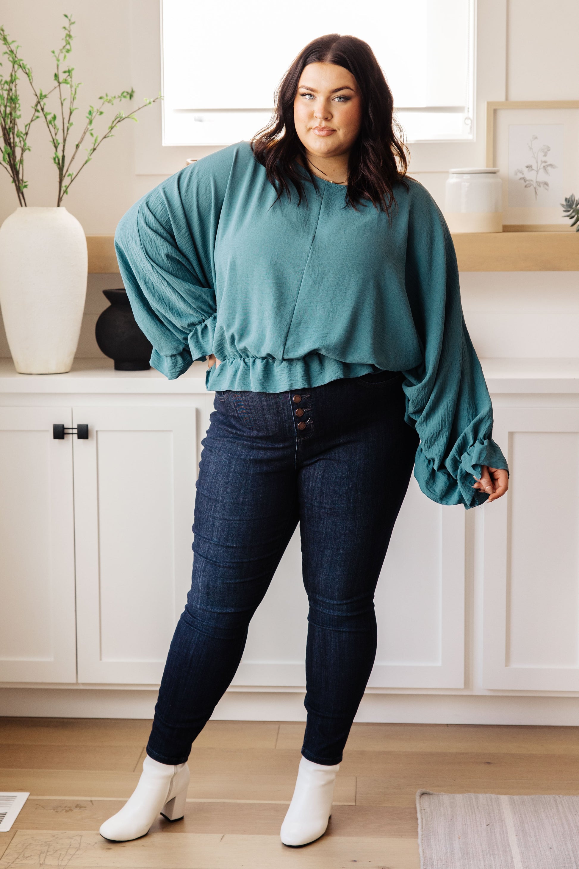 This Winging It Ruffle Detail Top in Teal is an easy way to add some texture and movement to any outfit. It features a comfortable, textured woven fabric with classic batwing dolman sleeves and soft ruffle trim details along the sleeve and hem. A cropped length and ruffled hemline completes the look for a perfect fit.
